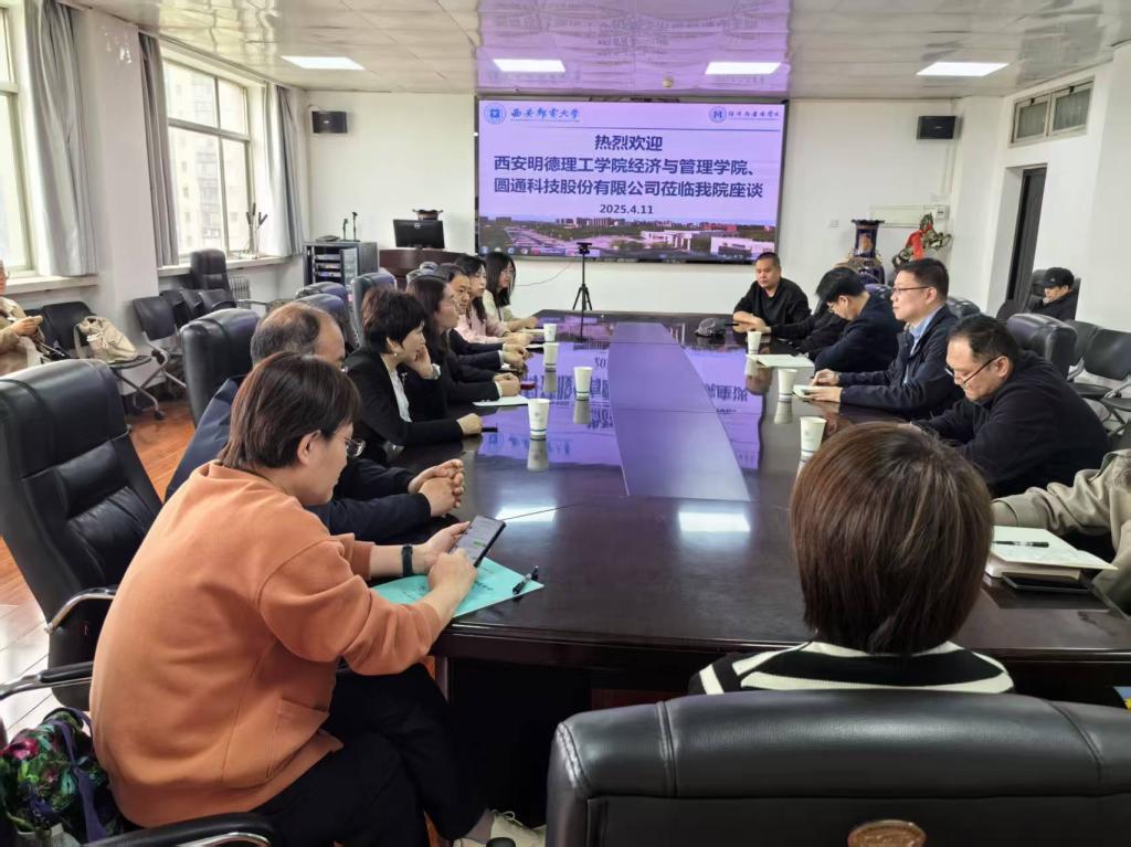 为探索应用型人才培养新路径,提高人才培养质量,在圆通科技股份有限公司对接下,4月11日,经济与管理学院党委书记何文举、数字金融产业学院副院长刘敏及会计学专业负责人张荣斌、教师代表一行6人赴西安邮电大学开展微专业建设调研。西安邮电大学经济与管理学院副院长侯光文、教务办主任朱文斌、工商管理系主任张权及各专业教师代表,圆通科技股份有限公司总经理张琼、副总经理付慧杰、圆通科学工作院总院副院长白雯丽参加了座谈交流。