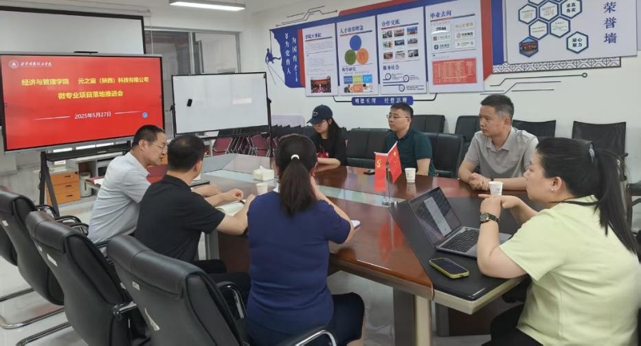 5月27日,经济与管理学院市场营销专业与元之宙(陕西)科技有限公司在明志楼北606召开“微专业”共建推进会,学院党委书记兼行政副院长何文举、数字金融产业学院副院长刘敏、市场营销专业负责人付铁岩、教师黄婕和阎玉鑫,元之宙(陕西)科技有限公司相关负责人一同参加了会议。会议由付铁岩主持。