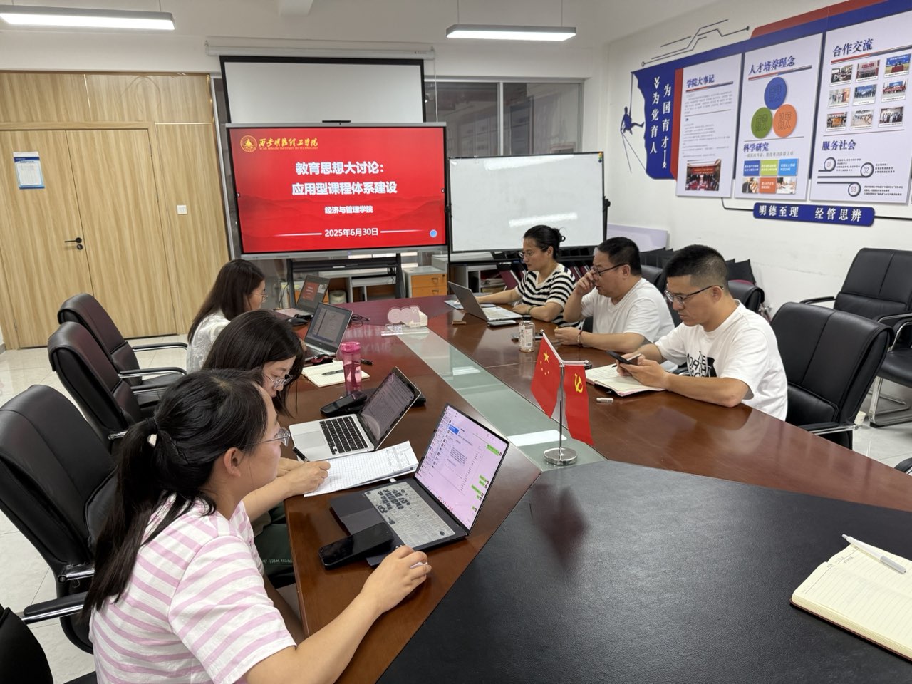 会上,许萍介绍了学院合格评估工作推进情况、存在的问题及下一步重点工作,对应用型课程建设的思路和想法与大家进行了交流。她谈到,应用型课程建设是推进产教融合、服务地方经济发展的关键抓手,实现课程内容需对接行业标准、突出能力导向,打破传统学科壁垒,打造“教-学-做-创”一体化的课程。刘敏结合学校“十四五”规划,分析了当前课程建设中存在的“重理论轻实践”“校企协同不足”等问题,强调应用型课程不是简单增减课时,而是要从课程目标、内容、评价等全链条进行系统性重构,以满足行业对应用型人才的需求。与会人员围绕应用型课程建设中的关键问题展开讨论,总结了产教融合过程中需要重视和解决的若干共性问题,着重对应用型课程建设中校外专家的工作量分配及报酬问题进行了探讨。