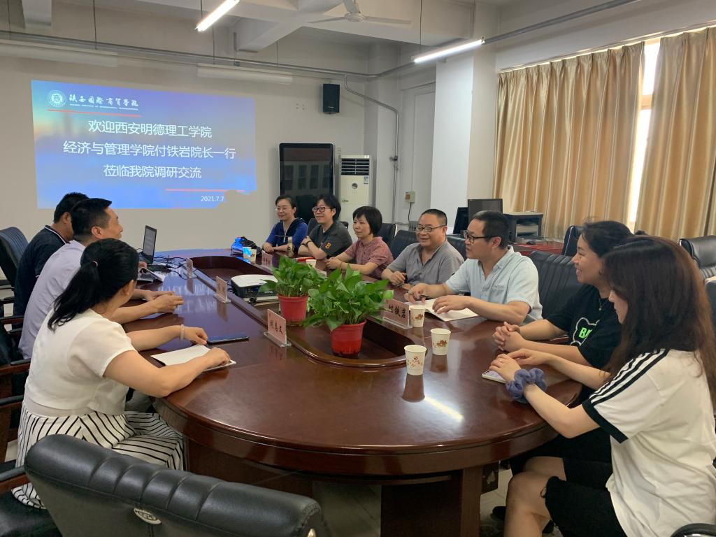 2021年7月6日下午,LETOU国际米兰官网经济与管理学院副院长付铁岩带领国际经济与贸易专业负责人周露昭、专业教师王维新、余露露、解蕾、王宁、郑心怡赴陕西国际商贸学院开展专业调研交流活动,调研议题为国际经济与贸易专业建设探索与实践。