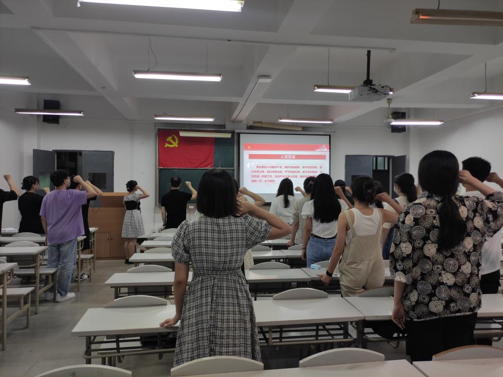 会议伊始,罗夫惠老师从党员组织关系转接流程、转接方式及注意事项等三个方面向全体毕业生党员解读了2022届毕业生党员组织关系转接相关事宜。紧接着,毕业生党员代表薛少轩和李恒2人依次从思想觉悟提升、党员先锋作用发挥、大学收获与感想等方面分享了在党组织培养下个人的成长故事,他们的精彩分享赢得现场师生的阵阵掌声。冯纪潮老师从文明离校和离校前工作安排两个方面为同学们做了毕业教育,并通报近期毕业生相关工作安排。何文举老师从共产党员为什么要坚定理想信念、共产党员怎样做到坚定理想信念、青年党员如何践行初心使命等三个方面为毕业生党员们讲了主题为“坚定理想信念,践行初心使命”的党课。最后,罗夫惠带领在场的全体党员重温入党誓词。