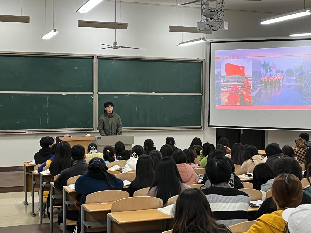 首先由翁宇凡同学分享个人事迹。他从五个方面分享了自己的军旅生涯:一是参军初心,从小怀抱军旅梦,献身消防终不悔;二是军旅经历,当兵方知当兵苦;三是不忘初心,两年军装,一生军魂;四是参军心得,学到最多的就是奉献;五是坚定信念,无论遇到什么艰难险阻,都要努力去克服、去打败。两年的军旅生涯,漫长又短暂。这段经历照耀着他也鞭策着他。接着由罗亮同学分享个人事迹。他的军旅生涯在十六小时的车程后拉开了帷幕,第一次五公里让他懂得了什么是坚持;第一次站夜岗让他懂得了什么是思念;第一次出任务让他懂得了什么是责任;偶然间看到了班长给大家盖被子让他懂得了什么是战友情。队伍在哪里,党旗就在哪里飘扬。最后由赵嘉琦同学分享个人事迹。他的救援情怀是源于2008年的汶川大地震,本着“一方有难,八方支援”的中华儿女家国情怀,在暑期河南水灾发生时主动请愿参加了长达七天的抗洪救灾活动。他一直坚持在灾后恢复的工作一线,用自己的实际行践行着当代大学生的使命与担当,在前线的所见所闻也更加坚定了他的入党信念和决心。
