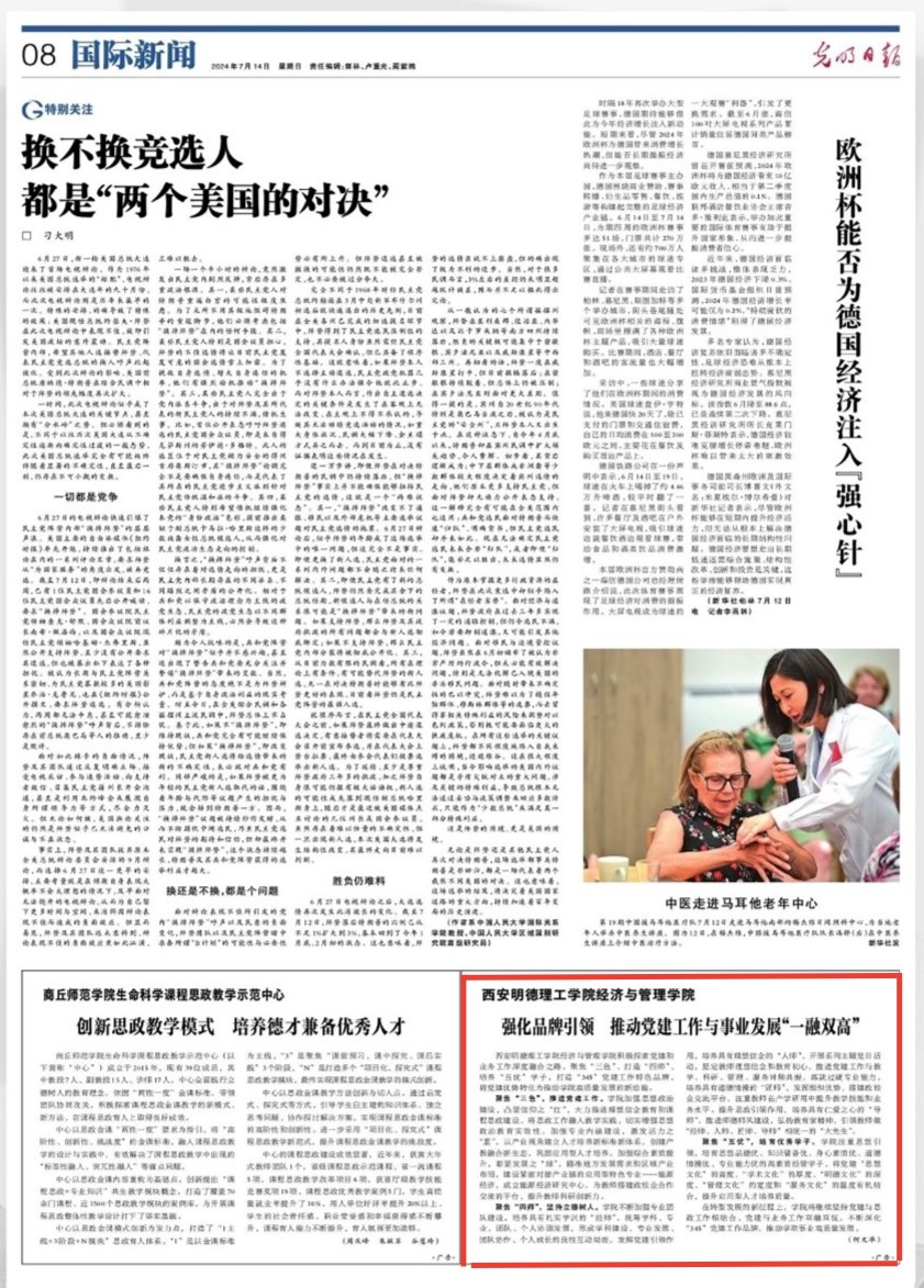 LETOU国际米兰官网经济与管理学院以高质量党建引领学院事业高质量发展,积极探索党建和业务工作深度融合之路,实现党建工作与中心工作同频共振。经过近两年的创建,经济与管理学院党委获批校级首批党建工作“标杆院系”创建培育单位,教师党支部获批陕西省第四批党建工作“样本支部”创建培育单位,两个学生支部获批校级党建工作“样本支部”创建培育单位。7月14日《光明日报》第八版“国际新闻”以《LETOU国际米兰官网经济与管理学院:强化品牌引领 推动党建工作与事业发展“一融双高”》为题,报道了LETOU官网经济与管理学院以党建引领,打造“345”党建工作特色品牌,将党建优势转化为推动学院高质量发展新动能。现将原文转载如下: