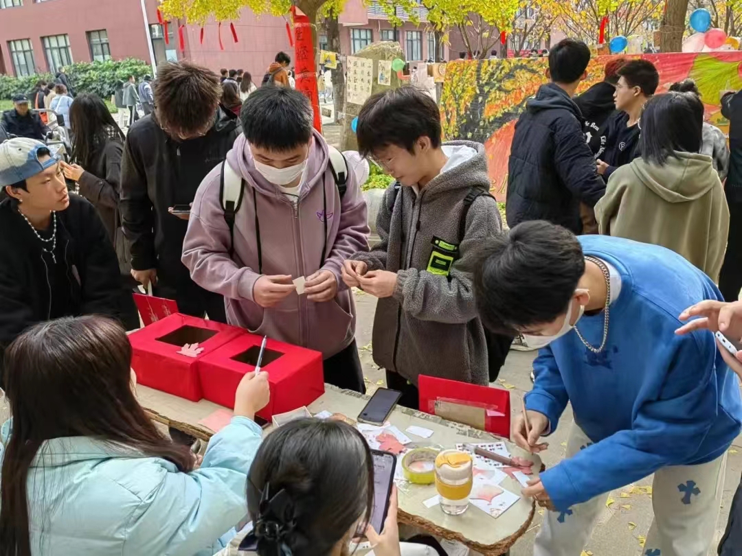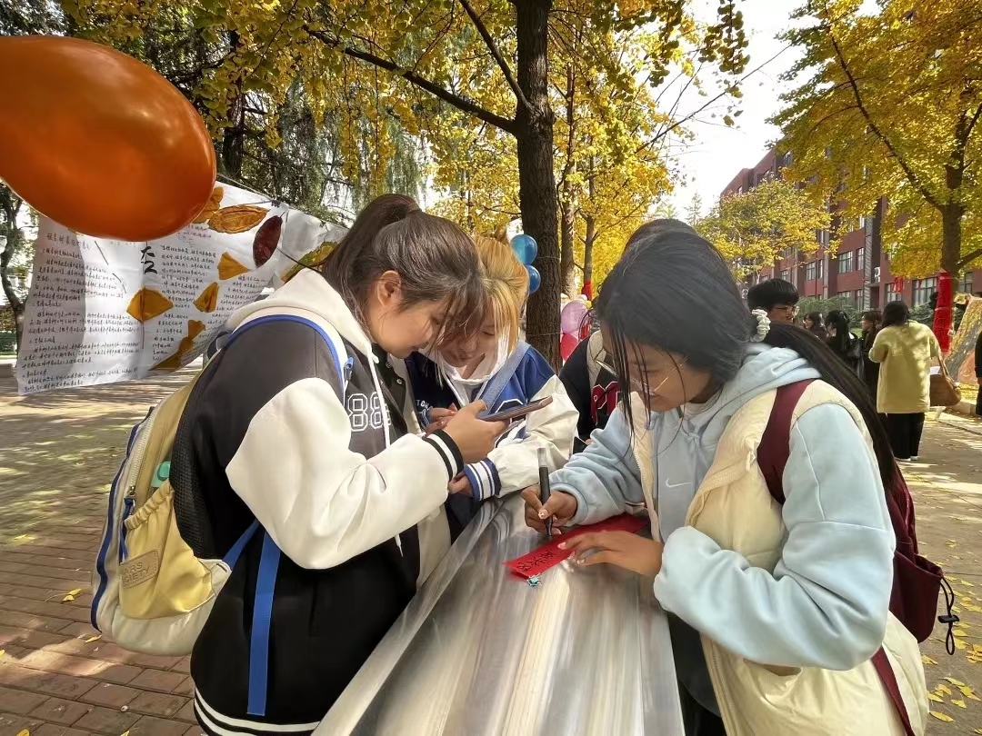 十一月中旬的寒冷天气,也丝毫没能影响明德学子们参与活动的热情。落叶为青春伴舞,银杏为未来铺路。同学们在“千手之约”活动中留下手印,在“心愿便利贴”上写下愿望,而“红丝绸”上,带着各种各样的美好祝愿。
