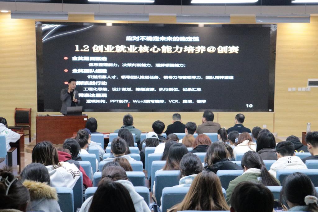 分享环节,董小泰会长为在场师生作了题为《赢@创赛--获奖导向的创就业核心能力培养》主题分享。董会长结合自身多年担任创业大赛评委和培训师的丰富经验,从比赛项目解读、项目打磨、团队建设、方法技巧等方面进行了深入浅出的讲解,给同学们提供了有针对性的参赛指导。互动交流环节,同学们踊跃提问,董会长耐心解答,现场气氛热烈。同学们纷纷表示,此次活动受益匪浅,不仅加深了对创新创业竞赛项目的理解,也明确了努力方向。