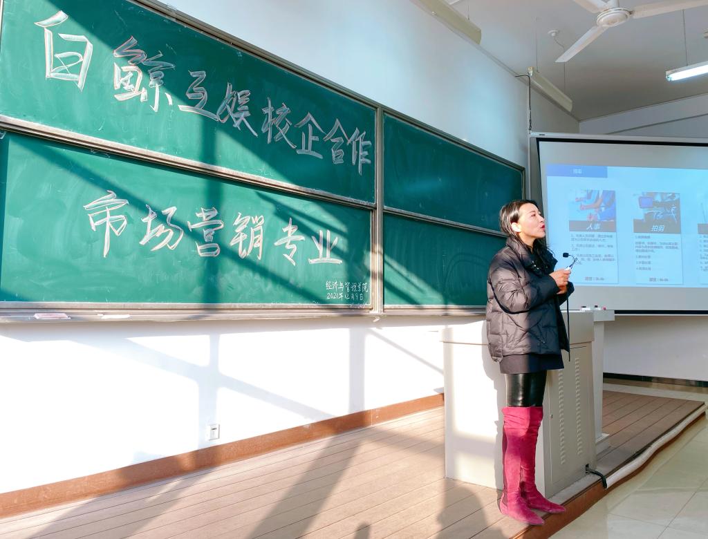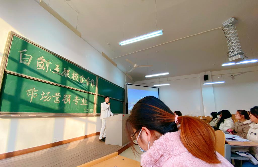 随后,白鲸互娱公司李博文总经理向同学们介绍了关于公司的主营业务、岗位需求及福利待遇,并欢迎同学们积极投递简历。白鲸互娱公司HR跟同学们分享了新媒体行业的就业政策、岗位选择和求职技巧。在自由提问环节,同学们积极互动提出疑问,李博文总经理与他的同事们耐心地进行解答,同学们也对于新媒体行业的就业事宜有了更深入的了解。