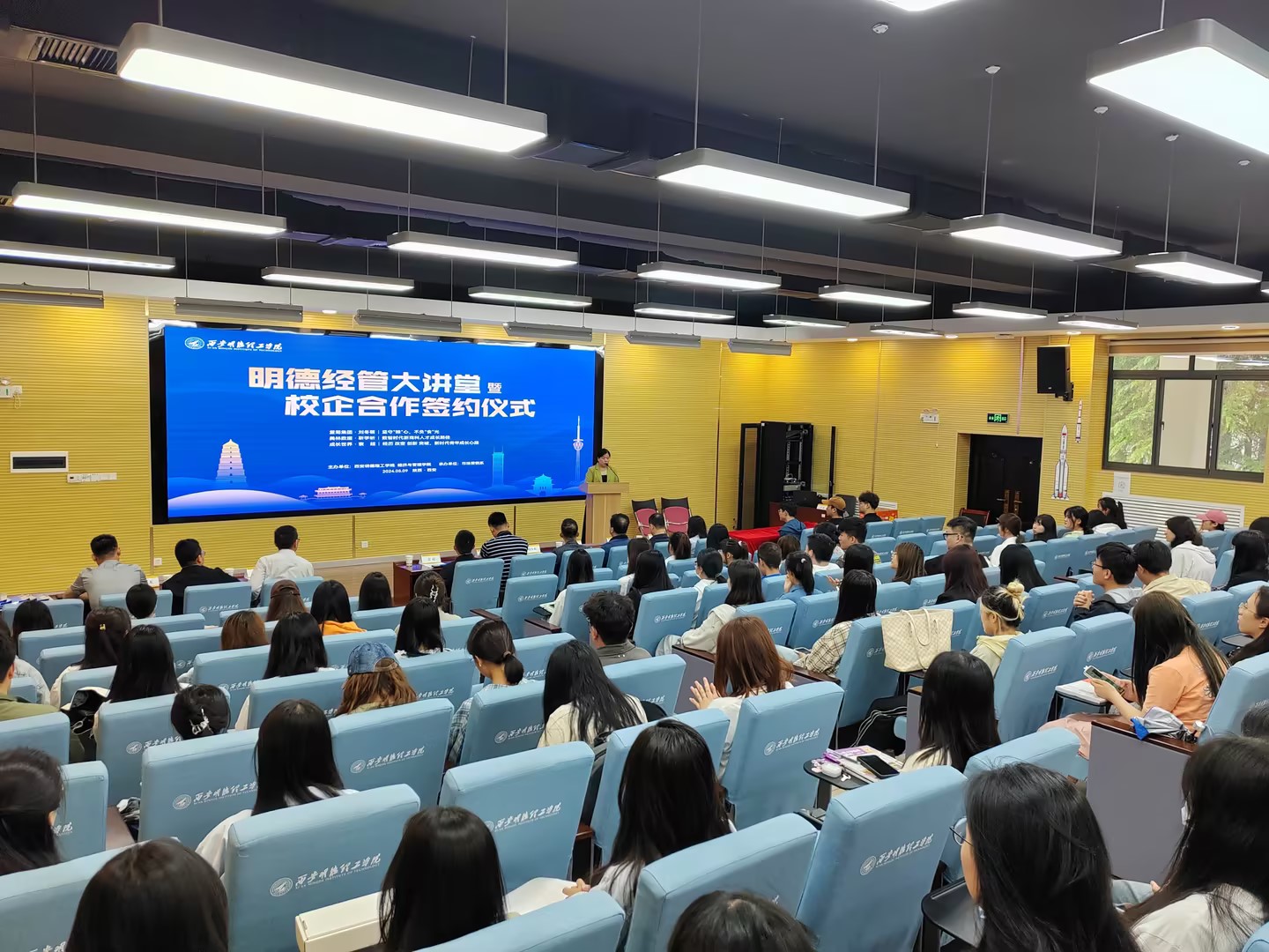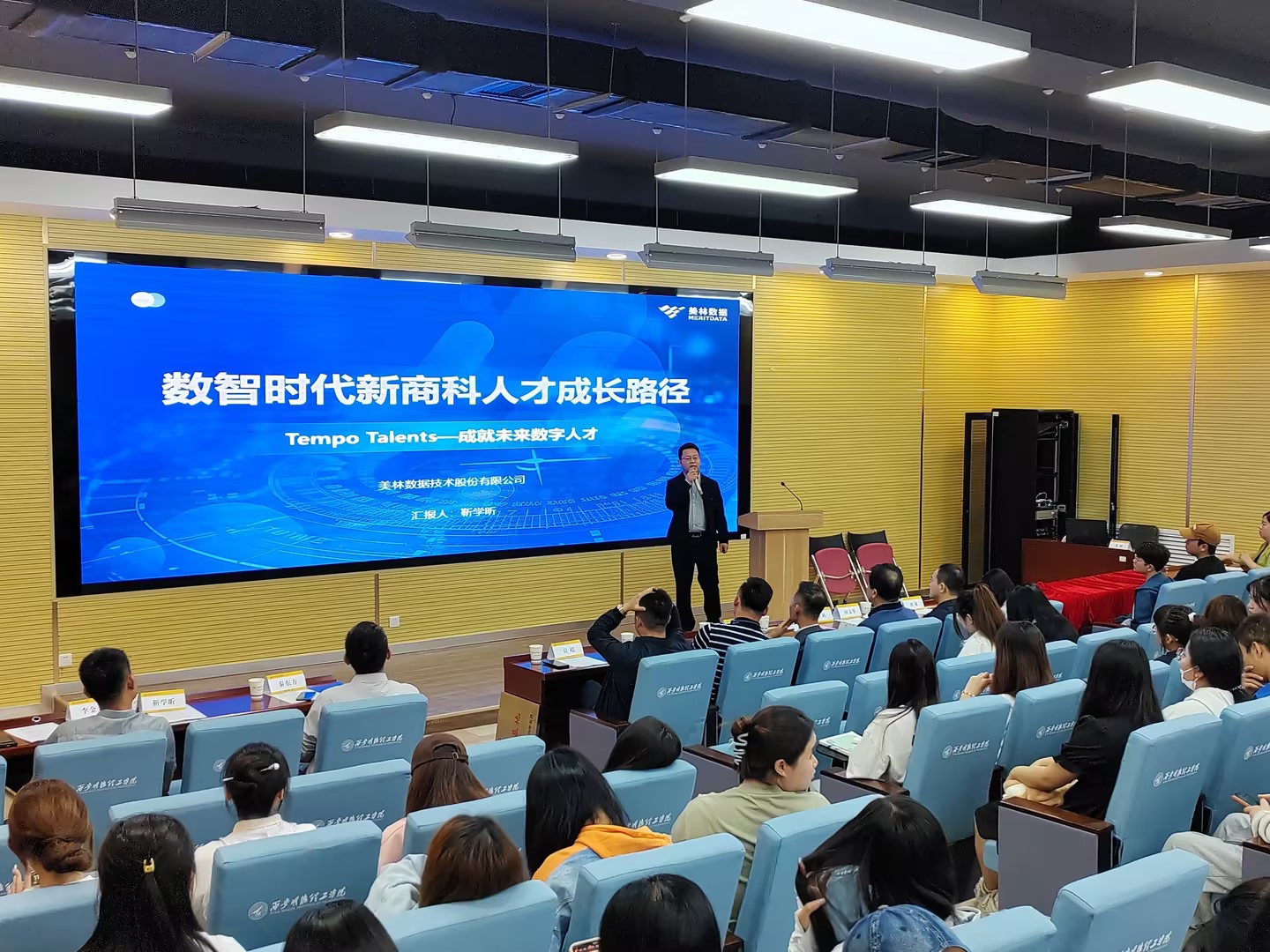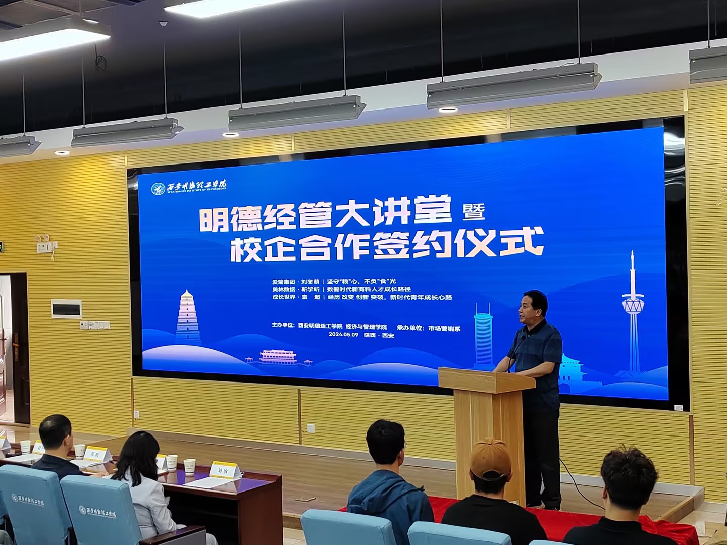 为深化产教融合,推进学校专业建设及人才培养模式创新,提高人才培养质量。5月9日,经济与管理学院在建德楼201举办明德大讲堂暨校企合作签约仪式。经济与管理学院院长郭鹏,党委书记兼行政副院长何文举,金融产业学院副院长刘敏,市场营销专业负责人秦东方、教师黄婕,西安爱菊粮油工业集团副总经理刘冬萌,美林数据技术股份有限公司产教融合事业部副总经理杨东涛、产教融合事业部客户总监李金龙、产教融合高级咨询顾问靳学昕,深圳成长世界教育科技有限公司总经理袁超以及师生代表150余人参加了活动。活动由黄婕主持。