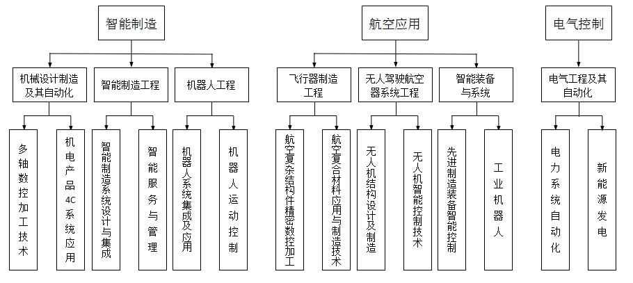 智能制造与控制技术学院面向智能制造、智能控制以及航空航天领域的新技术、新模式、新变革的人才需求,重点在航空复杂产品多轴数控加工技术、机电产品4C系统应用(CAD/CAM/CAE/CAPP)、智能制造系统设计与集成、智能服务与管理、航空复杂结构件精密数控加工、航空复合材料应用与制造技术、电力系统自动化、新能源发电、机器人系统集成及应用、机器人运动控制、无人机设计及制造、无人机摄影及应用、先进制造装备智能控制、工业机器人等十四个方向开展“一专多能”“产学研用”多方位协同育人的高素质应用型人才培养。