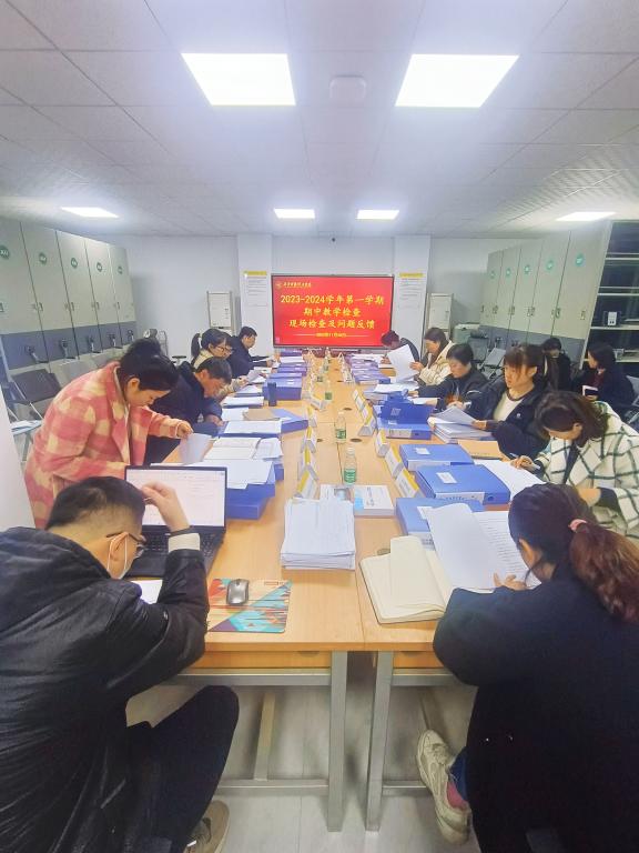 学校检查组依照《2023-2024 学年第一学期期中教学专项检查工作指标体系》以及《2023-2024学年第一学期期中教学检查随机抽检清单教案抽检清单》对学院资料进行检查。质量管理与评估办公室李海峰教授对本次检查工作进行了细致地反馈,指出学院对于《2023-2024学年第一学期期中教学专项检查工作指标体系》理解比较透彻,肯定了学院资料整理的细致与完整,同时也指出了学院在相关资料整理方面的不足。