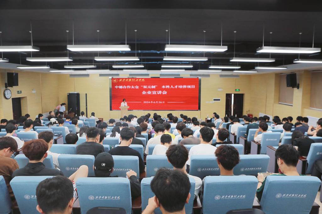 本次宣讲会旨在向机械设计制造及其自动化专业2022级学生介绍中德双元定制班的情况,探索校企合作新模式,促进定制班的成立。会议主题鲜明,内容丰富,既有项目介绍,又有企业宣讲,还有学生互动环节,为学生提供了一个全面了解中德双元制教育的模式的机会。