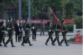 上午七时整,国旗护卫队精神饱满、英姿勃发,以铿锵有力、整齐划一的步伐护送五星红旗走向升旗台。伴随着庄严的《义勇军进行曲》,五星红旗迎着朝阳冉冉升起,全体师生肃立,齐唱国歌,行注目礼。
