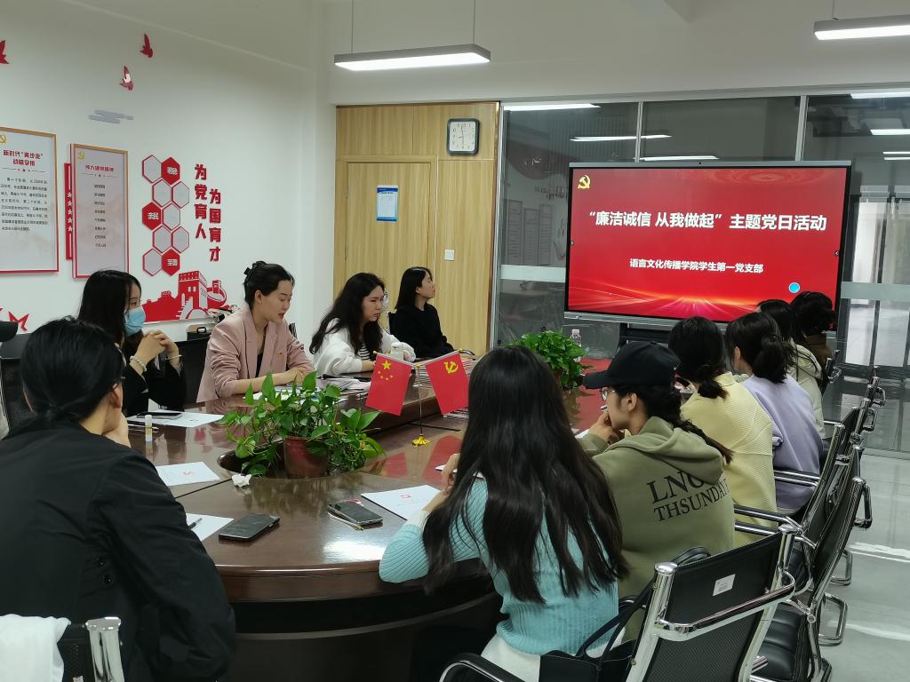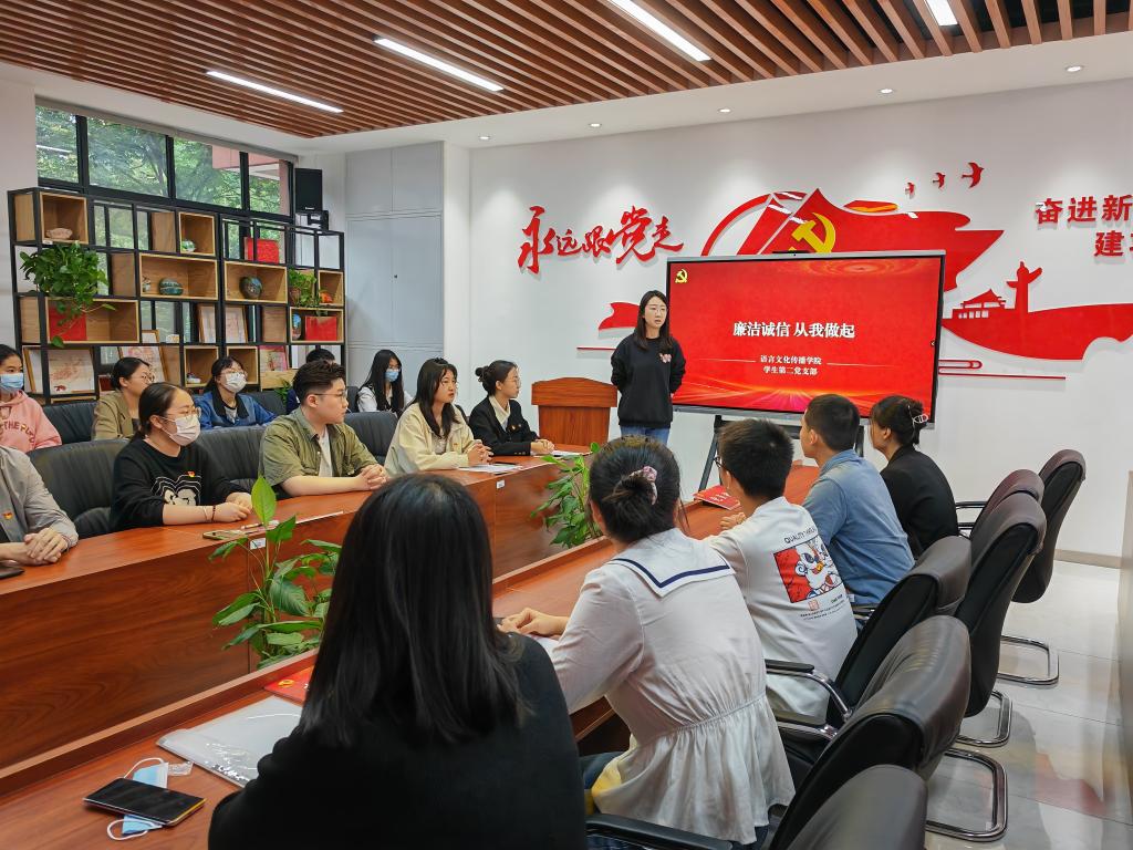 清风扬正气,廉洁润校园。为深入学习贯彻党的二十大精神,践行新时代廉洁文化建设的要求,增强学生党员廉洁自律意识,坚定理想信念,勇于担当的优良作风。5月28日晚上,语言文化传播学院学生党支部在明志楼北108党群服务中心和北406党员活动室分别开展了“廉洁诚信,从我做起”主题党日活动。会议由支部书记侯澄和梁爽主持,全体学生党员参加。