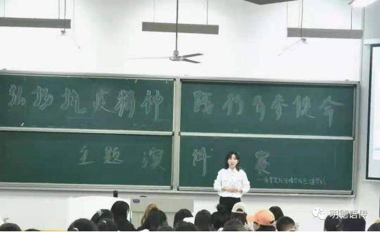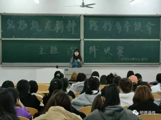 敖敏同学讲述了在疫情期间,当代青年面对疫情的无惧和勇敢,舍弃安逸生活跟随前辈脚步,与死神争分夺秒,挽救了一个又一个生命。敖敏同学也呼吁我当代青年以他们为榜样并向他们学习。