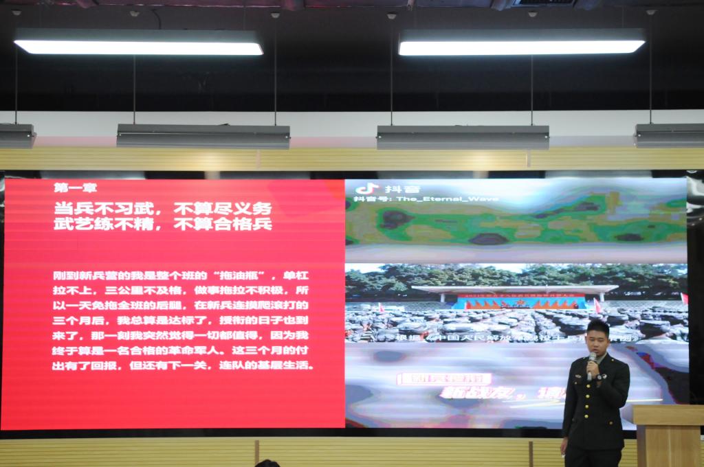 为落实立德树人根本任务,深化国防教育实践,充分发挥退伍大学生朋辈引领作用,增强学生国防意识和激发参军报国热情,12月5日晚语言文化传播学院举行退役大学生军旅生涯分享暨征兵宣传会。本次宣传会由22级学生刘千屹主持,学院4名优秀退役学生应邀参与分享。学校征兵工作站卓西洁,语言文化传播学院辅导员黄雪琪,以及学院2023级、2024级200余名学生参加了此次宣传会。