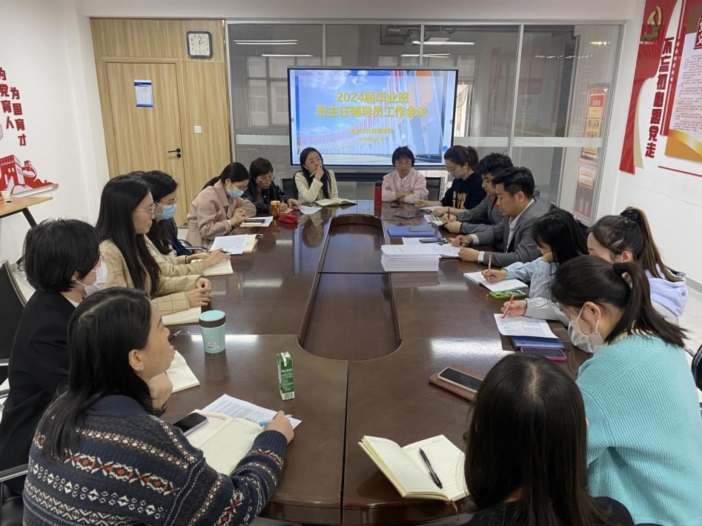 首先,杨峰传达了学校对班主任工作要求及对班主任接下来具体工作进行了部署。一是掌握毕业生学业重修情况,与重点学生谈心谈话,确保毕业生顺利毕业。二是摸清毕业生就业意向需求,建立工作台账、动态更新,积极开展就业帮扶。三是要积极深入学生、了解学生、关心困难毕业生就业、生活、心理等方面需求,将关怀落到细节。