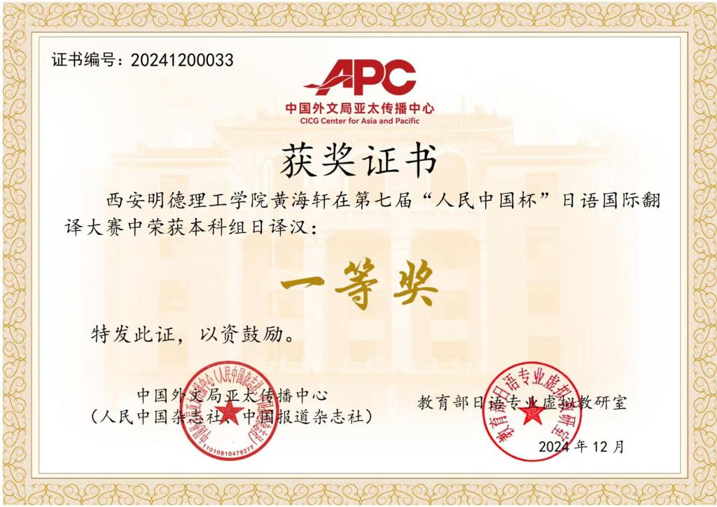语言文化传播学院日语专业2021级黄海轩同学获得“本科组日译汉一等奖”,2021级朱雯雯同学获得“本科组日译汉三等奖”。日语专业教师池华波获得“优秀指导教师奖”。