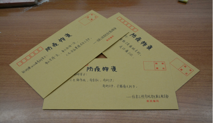365天的披星戴月,365天的挑灯夜读,考研的路上,你们不是单枪匹马,孤军奋战。信息工程学院学生第五党支部党员先锋队亲手为考研学子准备爱心信封。信封里装有医用口罩和湿巾,每一个信封上都有不同的励志话语和专属祝福。见字如晤,墨香里是我们的温暖的叮咛与殷殷的希望。
