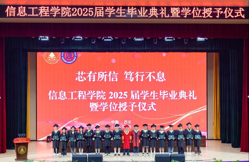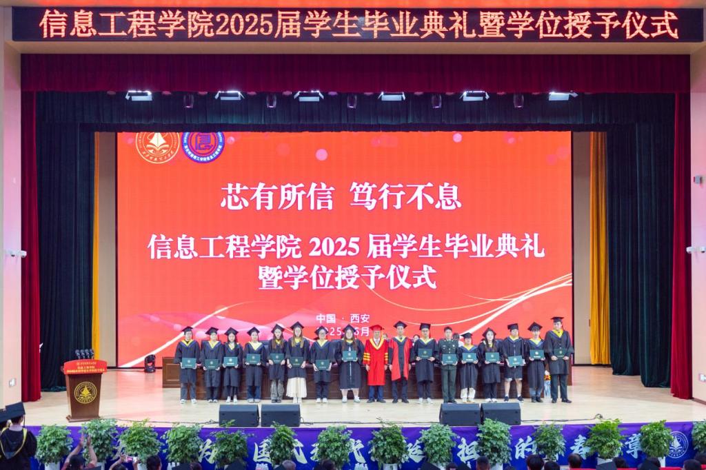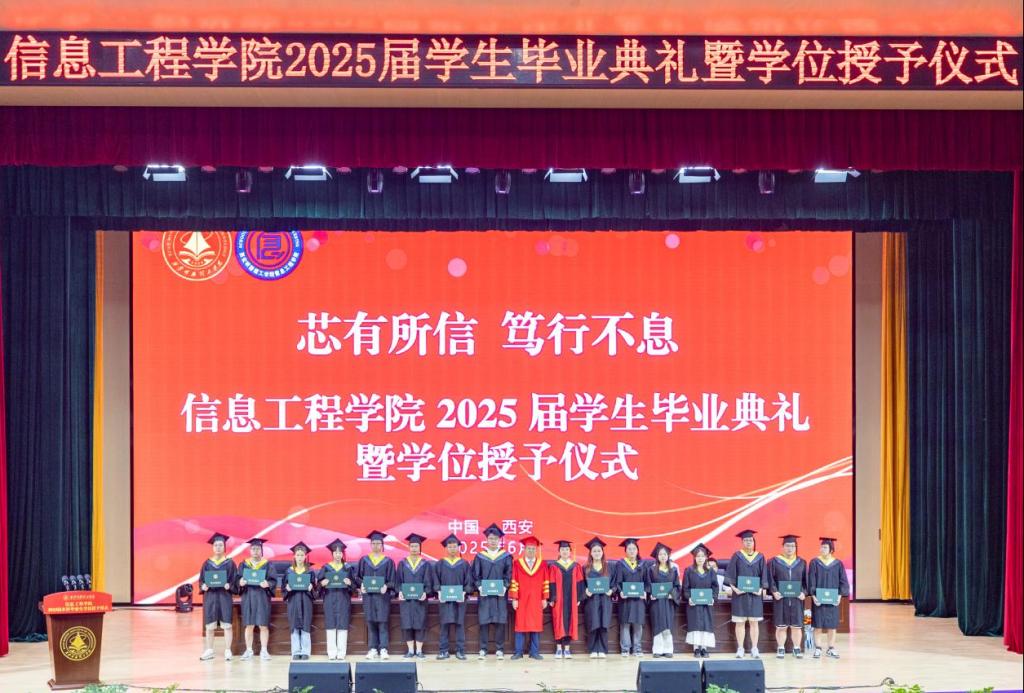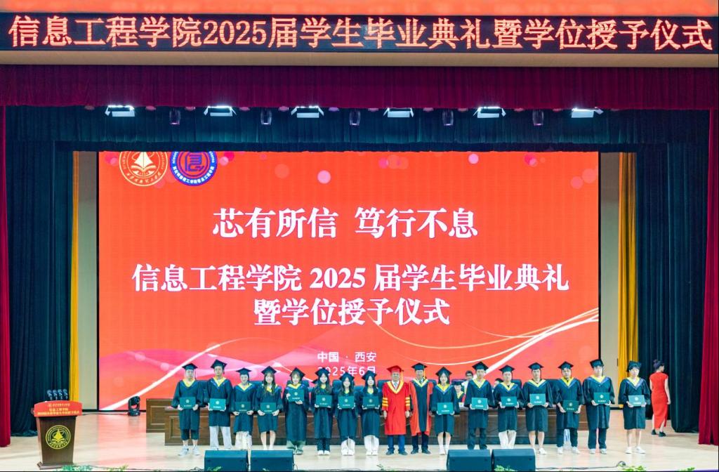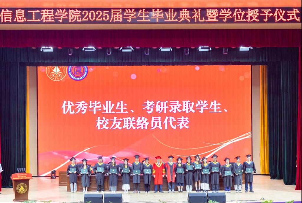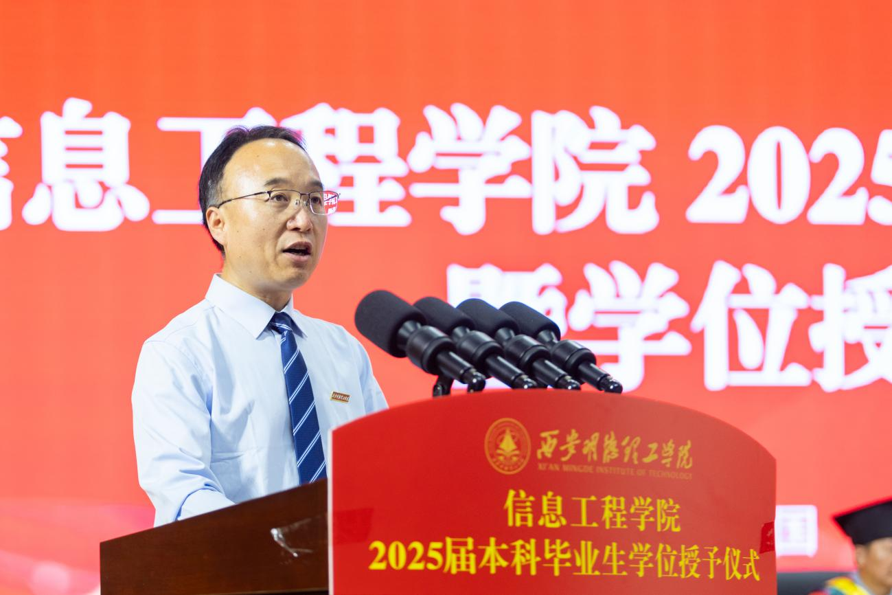 盛夏蝉鸣起,骊歌再奏响。6月24日上午,信息工程学院在四季廊桥报告厅举行2025届学生毕业典礼暨学位授予仪式。出席典礼的有学校校长王志刚,学院党委书记肖千春,学院副院长范晖、张伟岗,学校学位评定委员会委员、北斗应用技术学院副院长张健,学校学位评定委员会委员陈世亮,学院党委副书记高长江,学院办公室主任尹莹,各专业负责人、家长代表、毕业班辅导员、全体2025届毕业生。典礼由学院党委书记肖千春主持。