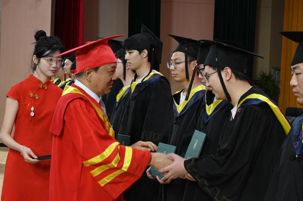 学位授予仪式开始。学校校长王志刚教授、学院副院长范晖教授、张伟岗教授,学校学位评定委员会委员、北斗应用技术学院副院长张健教授,学校学位评定委员会委员陈世亮副教授,为毕业生拨穗正冠并颁发学位证书。同学们依次上台并合影留念。