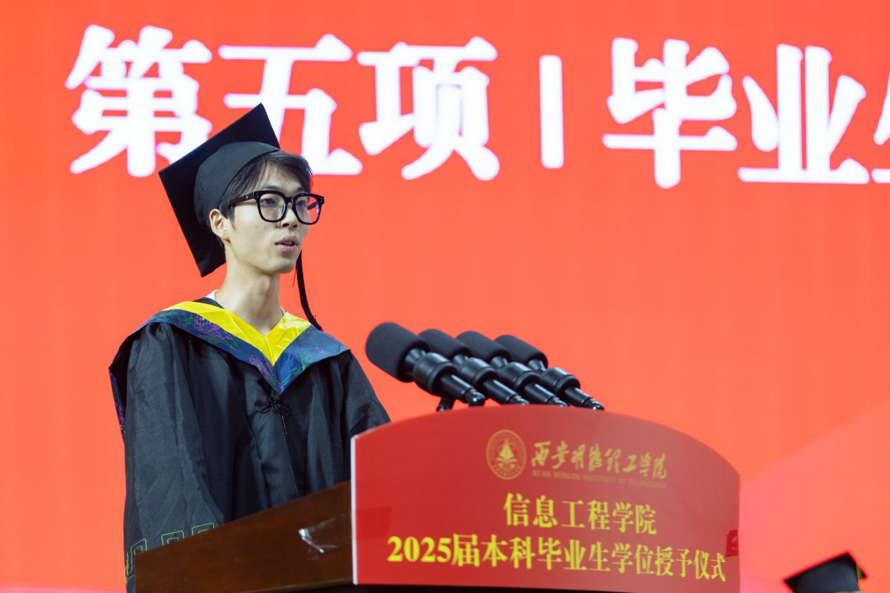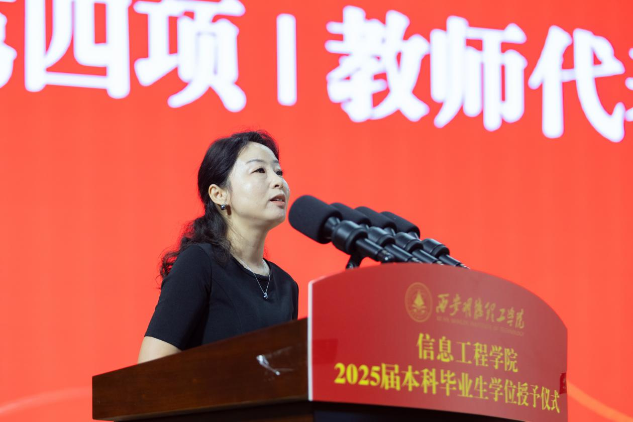 教师代表马蕾教授向学院圆满完成学业的毕业生送上美好的祝福。他希望同学们永远保持对技术的热爱与探索的热情,用所学知识为社会创造价值;在面对挑战时,能够沉着冷静,用智慧与勇气攻坚克难。在信息技术这个快速发展的领域保持竞争力,同时时刻拥有一颗感恩的心,承担起历史赋予的责任和使命,成为国家栋梁之才,做永远向上的中国青年!