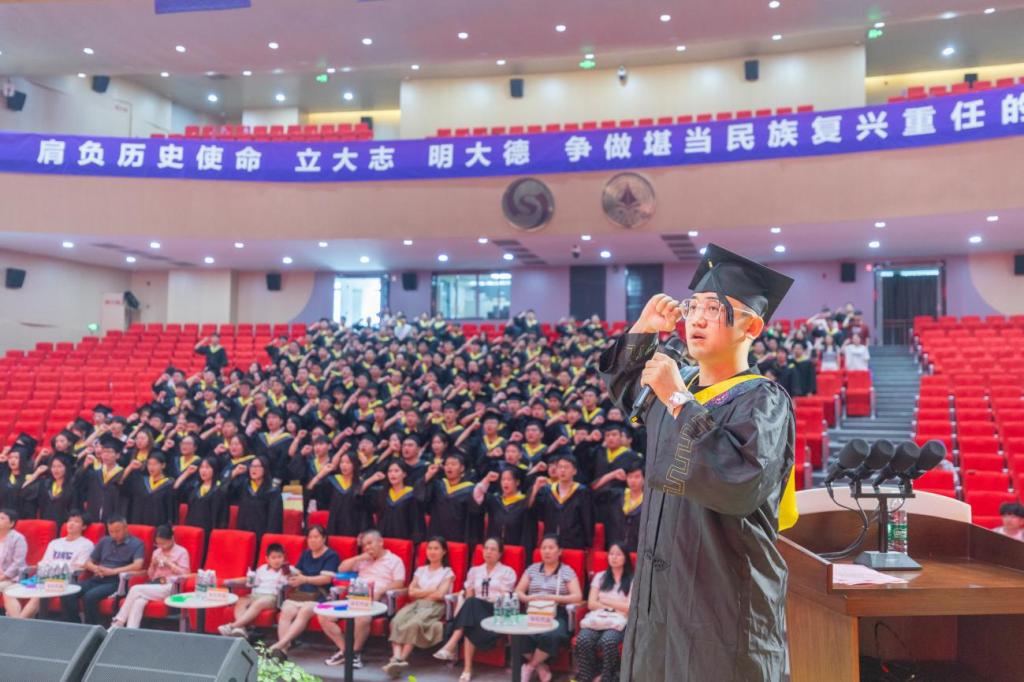 毕业生代表魏帅发言,作为一名西部计划志愿者,将带着母校的嘱托、学院的期望和四年所学,踏上西行的列车,奔赴新疆,让青春在祖国最需要的地方绽放。带着学院的期望和嘱托,用好所学知识,开创崭新未来。以更饱满的热情和更坚定的信念,为社会发展进步贡献力量!