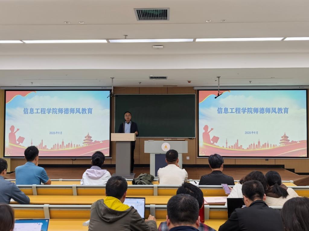 为深入学习贯彻新时代教师队伍建设的新要求,全面提升教师思想政治素质和职业道德水平,9月19日14:30,信息工程学院在8#402召开全院师德师风教育大会。大会由学院党委书记肖千春主持,全体教职工参加。