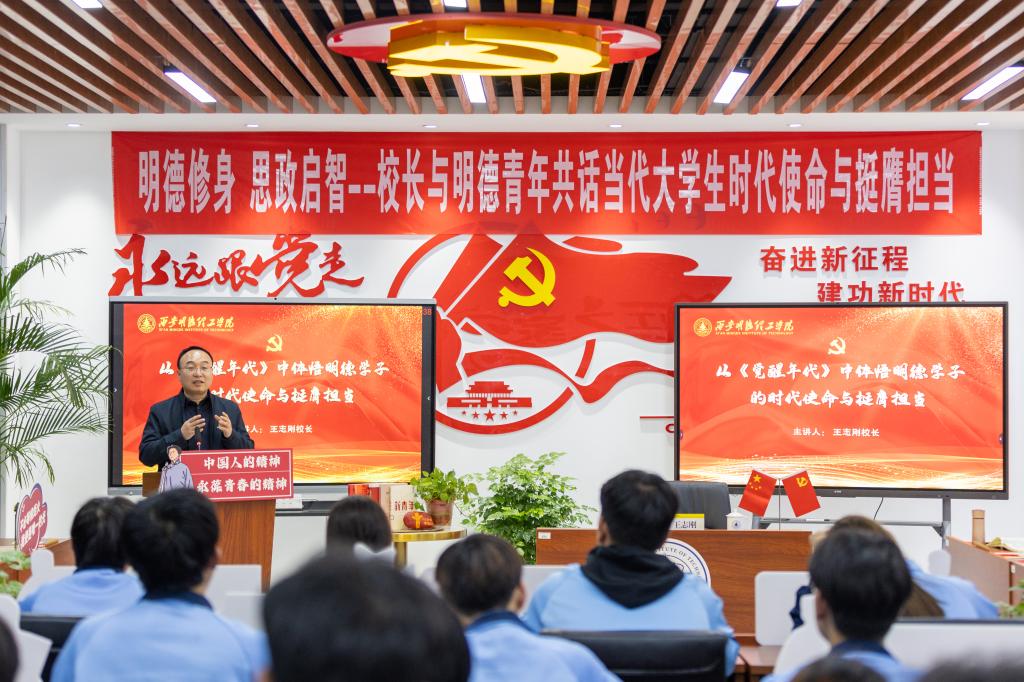为深入学习贯彻习近平总书记关于思政课建设的重要论述精神,坚持用习近平新时代中国特色社会主义思想铸魂育人,引导明德学子树立正确的世界观、人生观、价值观,让思想政治教育走近青年学生,成为人生航灯。12月4日,校长王志刚走进课堂,与信息工程学院2024级计算机科学与技术7班的同学们零距离对话与接触,开展了一场题为《从<觉醒年代>中体悟明德学子的时代使命与挺膺担当》的思想思政课。学院党政班子成员及辅导员老师齐聚一堂,共享这场思想启迪之旅。