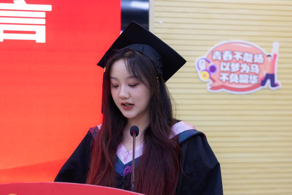 优秀毕业生代表郭可盈在发言中回顾了四年大学生活,分享了个人在学习、生活和社会实践中的成长,表达了对母校、师长和同窗的感激之情。呼吁全体毕业生要铭记母校教诲,以“强国有我”的使命担当,在实现中华民族伟大复兴的征程上,书写属于明德学子的精彩华章。