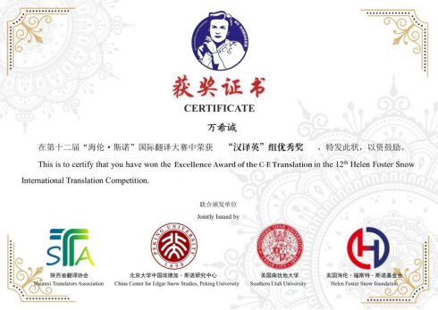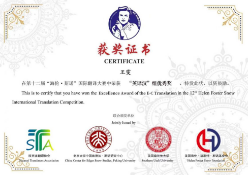 第十二届“海伦·斯诺”国际翻译大赛学生获奖名单及证书: