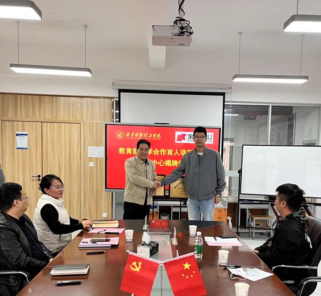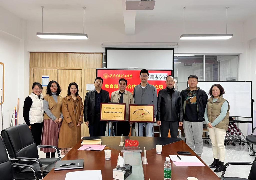 会后,由金山办公教培中心负责人肖璨与郭鹏院长为“金山办公技能认证(KOS)中心”和“教育部产学合作协同育人项目立项单位”揭牌。