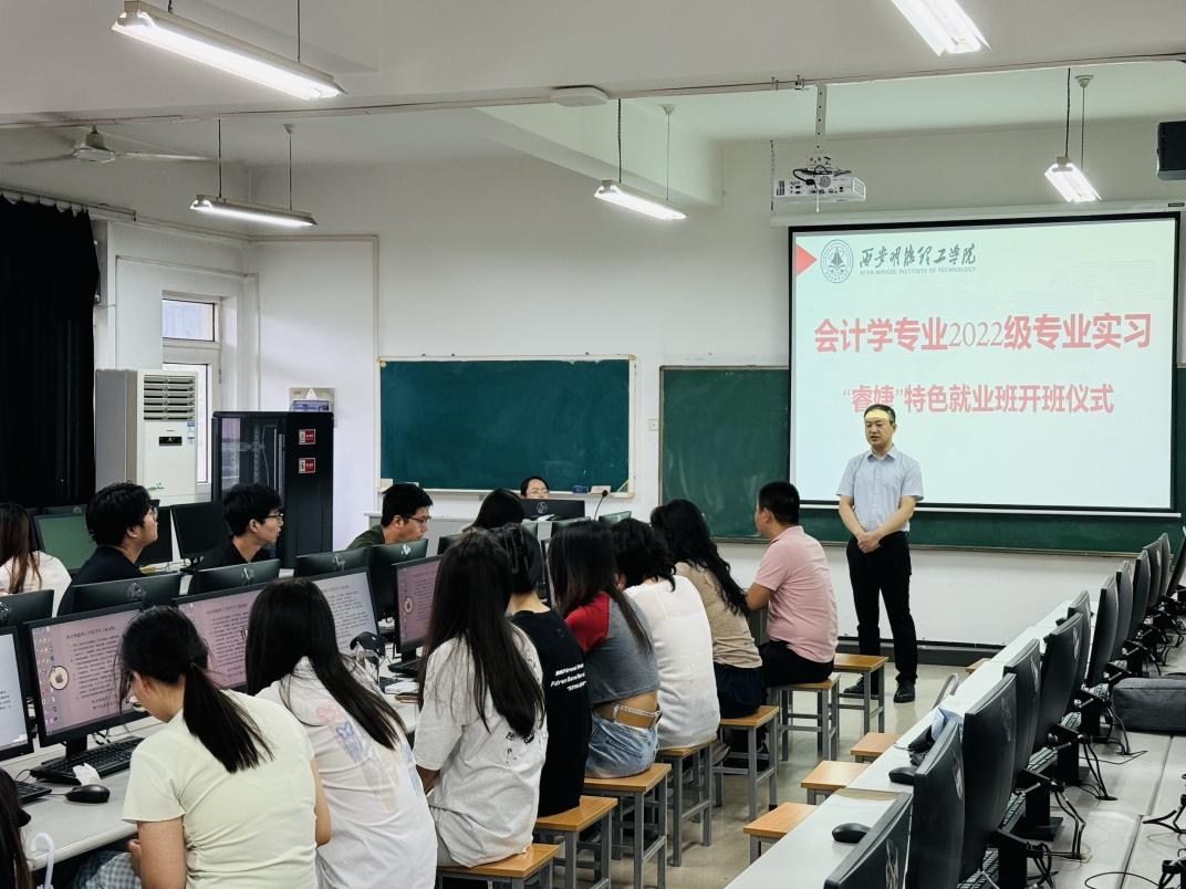 为进一步深化校企合作,推进校企协同育人,为学生搭建高质量实践与就业平台,6月30日上午,经济与管理学院会计学专业在明理楼318举行“睿婕”特色就业班开班仪式。学院党委书记兼行政副院长何文举、专业负责人张荣斌、孙琳,西安睿婕财务管理有限公司总经理田永刚、实训负责人韩蓓,20名入选特色就业班的学生参加了开班仪式,仪式由孙琳主持。