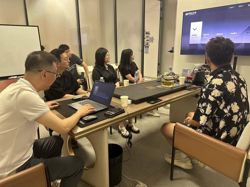 参观结束后,双方围绕产教融合、实习平台共建及第三学期实践教学等议题展开座谈。公司总经理高斌详细介绍了企业发展历程、业务布局及影视动画、三维游戏、AI短剧等标杆项目案例;肖瞳老师则从专业设置、人才培养目标及近年教学成果出发,强调学院“创新+实践”的培养理念。灵机互动业务部经理杨剑进一步就校企合作模式、岗位需求标准等细节与校方进行了务实沟通,为后续合作落地厘清了方向。