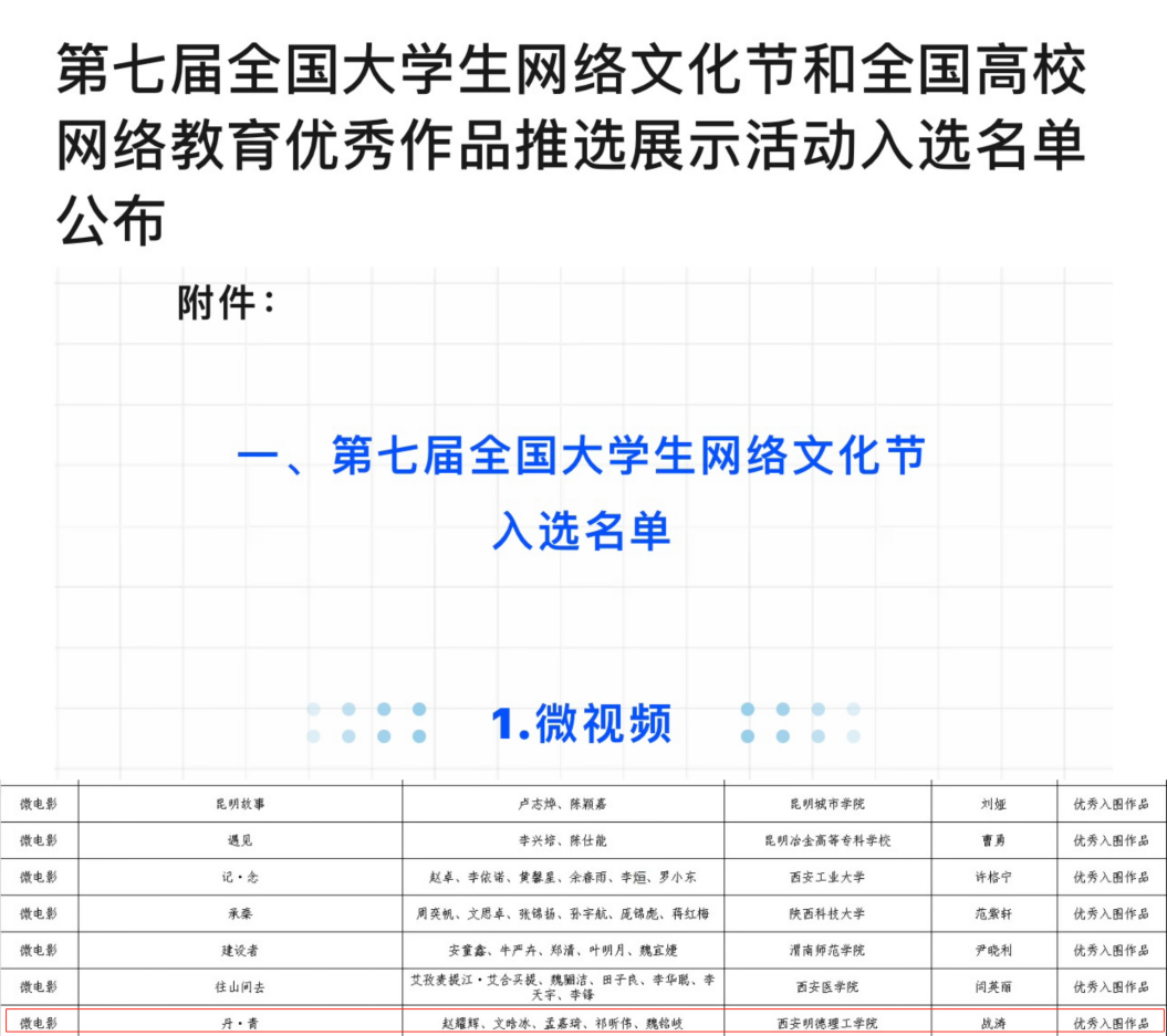 近日,由教育部思想政治工作司与中央网信办网络社会工作局携手举办的第七届“全国大学生网络文化节”及“全国高校网络教育优秀作品推选展示活动”圆满落幕,并正式公布了备受瞩目的遴选结果。LETOU官网艺术与设计学院播音与主持艺术专业战涛老师指导的原创微电影《丹·青》从全国31个省(区、市)和新疆生产建设兵团所推荐的五万余件作品中脱颖而出,荣获新媒体作品类“优秀入围作品”。