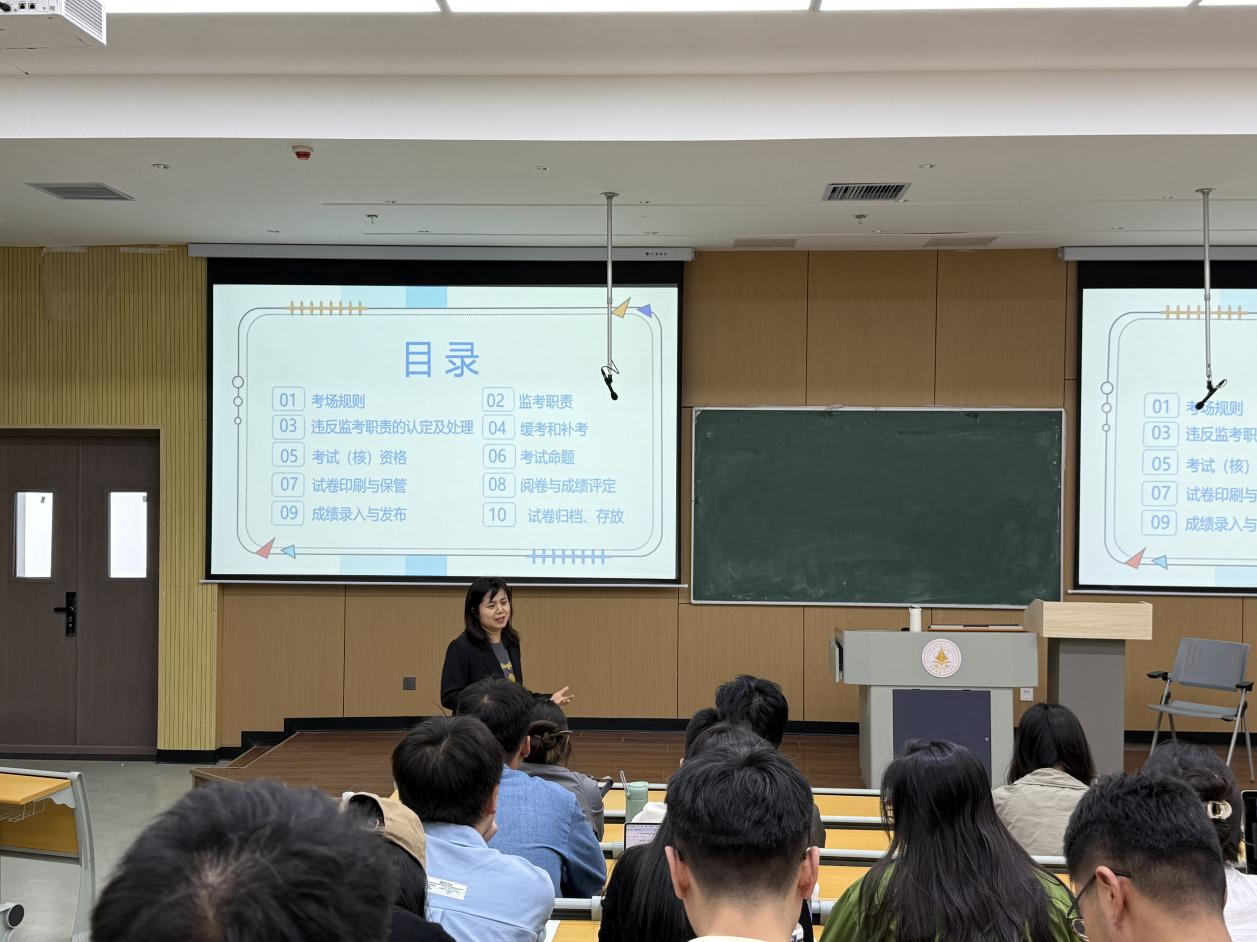 办公室主任吴君详细介绍了考试相关内容,包括学生与教师应遵守的考场规则、违反监考职责的认定及处理、考试(核)资格、考试命题、阅卷与成绩评定的注意事项等。她还就命题中的常见问题作了详细分析,并对如何设计高质量试题提出了建议。与会教师针对自己在命题和评卷中的疑惑进行了提问,并与培训教师进行了深入的交流。