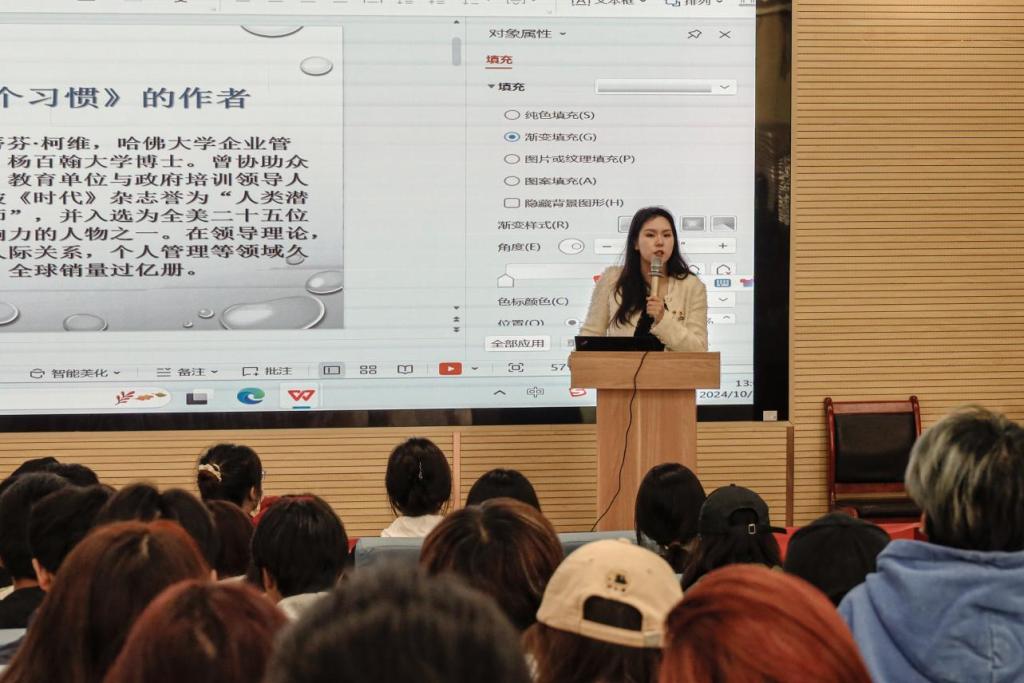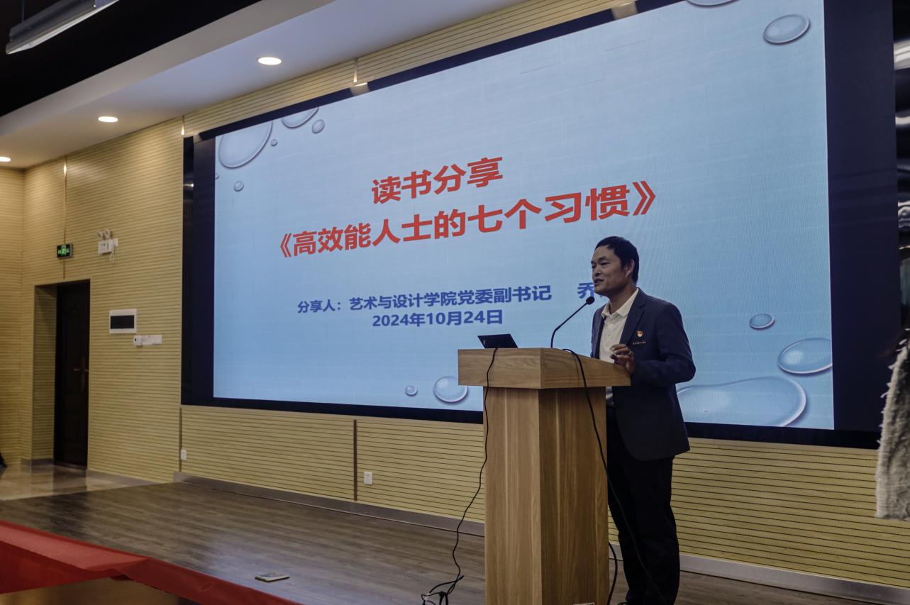 会议伊始,艺术与设计学院团委书记刘一涵向各位同学介绍了读书的好处作用,强调作为新时代青年,希望各位学生能够用自己的课余时间多读书,读好书,在阅读中体悟人生道理,长见识,拓视野。随后向各位同学介绍了本次读书分享会的主讲老师—艺术与设计学院党委副书记乔建。乔建老师围绕《高效能人士的七个习惯》展开了深入分享,他不仅详尽阐述了书中每一个习惯的核心理念及其实践策略,还特别强调了这些原则对于个人成长、团队合作乃至组织发展的重要性。从“积极主动”的态度培养到“以终为始”的目标设定;从倡导“双赢思维”的合作模式到追求“不断更新”的自我提升,每一环节都被赋予了生动具体的例子和实用建议。乔建老师鼓励大家将这些宝贵的习惯融入到日常生活与学习中去,相信各位同学通过持续践行,每个人都能在各个方面取得显著进步,并为所在团队带来积极影响。