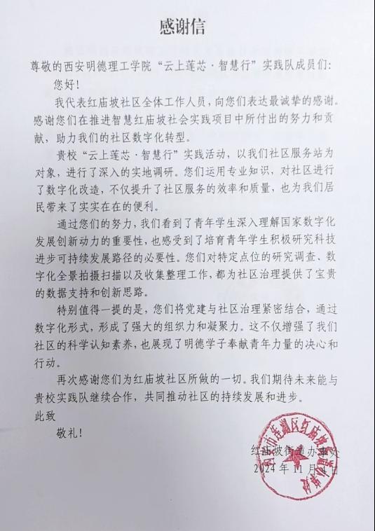 近日,我院“云上莲芯·智慧行”暑期“三下乡”社会实践队收获一封感谢信,红庙坡街道办事处对实践队在推进智慧红庙坡社会实践项目中所付出的努力和贡献表示衷心的感谢。