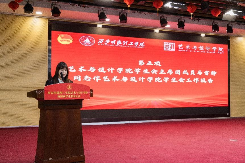 艺术与设计学院学生会主席团成员马雪静同学向大会作题为《初心不忘勇担当,青春奋进铸辉煌》的工作报告。在《初心不忘勇担当,青春奋进铸辉煌》工作报告中,马雪静提出思想引领的核心地位与干部队伍建设的重要性。她提出,2025年是深化落实团十九大精神的关键之年,学院学生会将以“青年大学习”为抓手,创新开展“艺心向党”主题团日活动,通过组织红色艺术创作展、党的二十大精神微宣讲团进班级等特色活动,将理论学习与专业实践深度融合。同时,依托新媒体矩阵打造“云端思政课堂”,以青年学子喜闻乐见的短视频、漫画等形式,推动团十九大精神入脑入心,切实增强思想引领的针对性与实效性,引领全院青年坚定理想信念,在新时代的壮阔征程中锚定方向、勇毅前行。