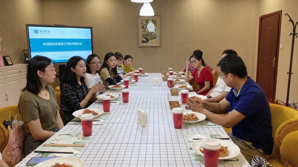 参观结束后,我院八位老师与博雅书院的五位老师进行了深入的座谈交流。博雅书院事务科科长张理斌、专业负责人文立磊与胡科长一起就学生管理、增进第二课堂活动积极性等工作的相关经验进行了交流分享,双方相互表达了继续深入交流的意向。此次前往西京学院博雅书院的考察调研使各位老师收益良多,亦为日后的工作带来了一定思考与启发。