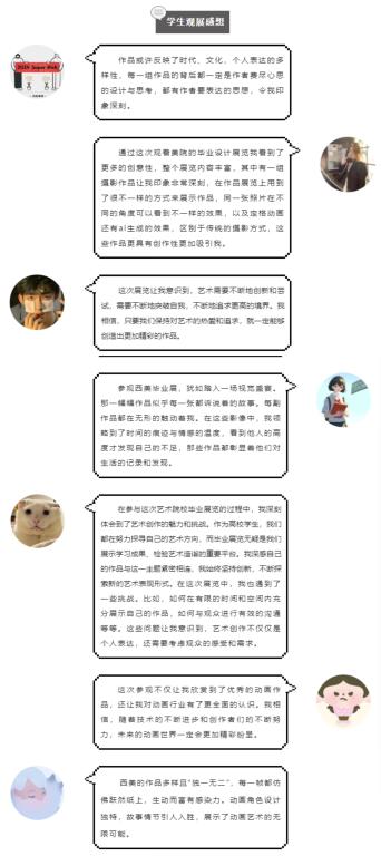 本次观展使同学们接触到西安美术学院影视动画系2024届本科毕业设计展的作品,这为我院学生带来了新的视野和想法。通过欣赏其他院校学生的作品,有助于了解不同学校的艺术教育和创作风格,还能受到其他同学作品的启发,激发学生获得新的创作灵感及思路。本次观展也为数字媒体艺术专业的学生提供了与创作者密切交流的机会,他们可以直接了解作品的创作初衷、背景故事以及拍摄理念,从而更深入地理解作品,并且,他们能够分享彼此的观点和感受,从而激发更多的想法。