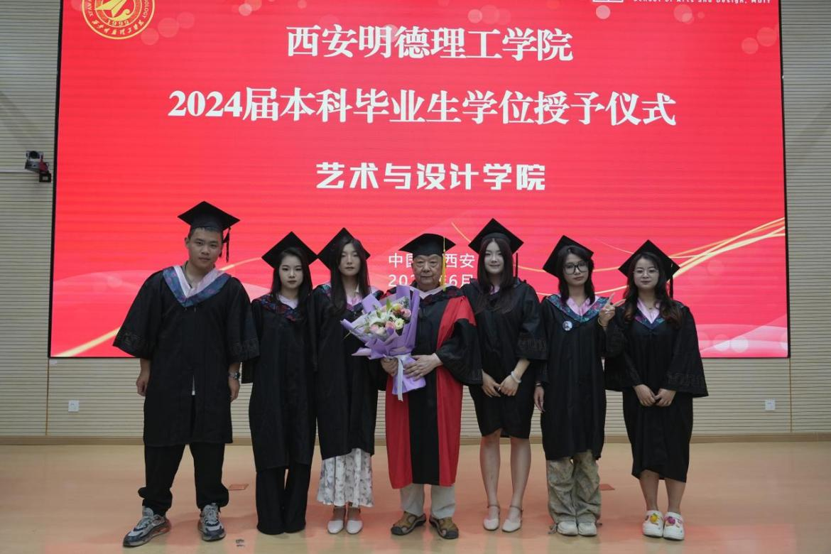 学位授予仪式开始。学院院长苟秉宸教授,副院长冯强老师,学院特聘教师、大师工作室柏雨果教授,学校学位评定委员会委员舒粉利老师为毕业生拨穗正冠并颁发学位证书。同学们依次上台并合影留念。