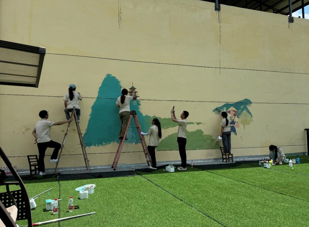 艳阳当空,阳光如火, 热情奔放, 让人感受到夏日的炽烈与活力。我们也受此感染浑身充满了干劲,怀着满腔热忱积极的投入本次的墙绘工作。在开展墙绘工作的过程中,我们高度的默契和亲密无间的合作精神,每位成员都充分发挥自己的特长,共同为这幅墙绘注入了生命与活力。从构思设计到调色涂漆,每一个环节都凝聚着我们的汗水和智慧。在相互协作中,我们不仅加深了彼此的了解,更在艺术的海洋里共同成长。这段经历让我们深刻体会到,团结的力量是无穷的,而每一次的合作都是我们成长的宝贵财富。