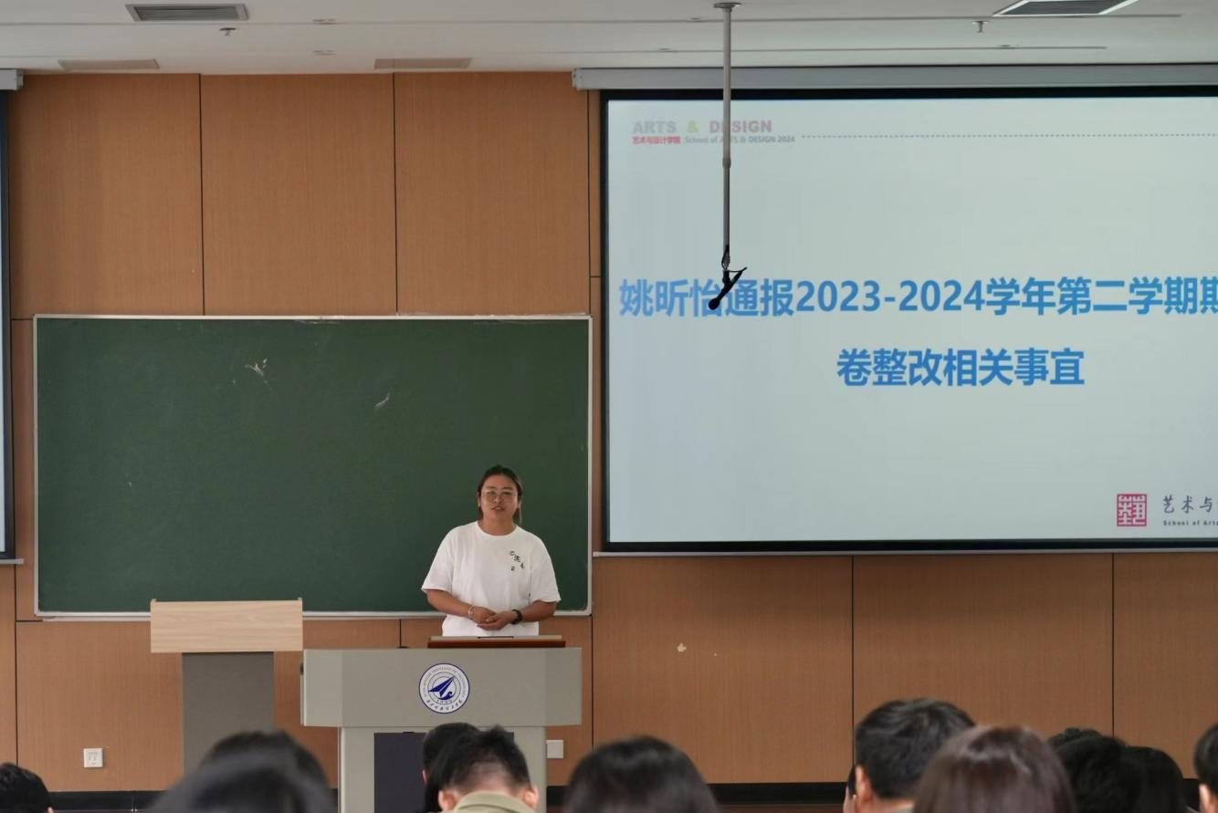 教务员姚昕怡老师通报2023-2024学年第二学期期末试卷整改情况。为了扎实推进评建工作,学校邀请专家进校对期末试卷进行了专项检查,并下发了关于试卷专项整改的文件,要求所有阅卷老师对标对本,针对专家提出的意见,认真完成整改,全面提升学院试卷命题及批改质量。