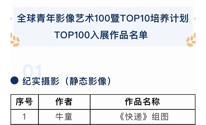 此项目于5月25日至8月10日进行作品征稿,总计收到来自中国、美国、韩国、土耳其、意大利、印度、俄罗斯、缅甸等10余个国家3000多位国内外作者的6万余幅参赛作品。经过终评评选委员会公开、公平、公正的民主评选,最终评出100件入展作品,其中,我专业教师牛童的组图《快递》获得全球青年影像艺术100暨TOP10培养计划“TOP100入展作品名单第一