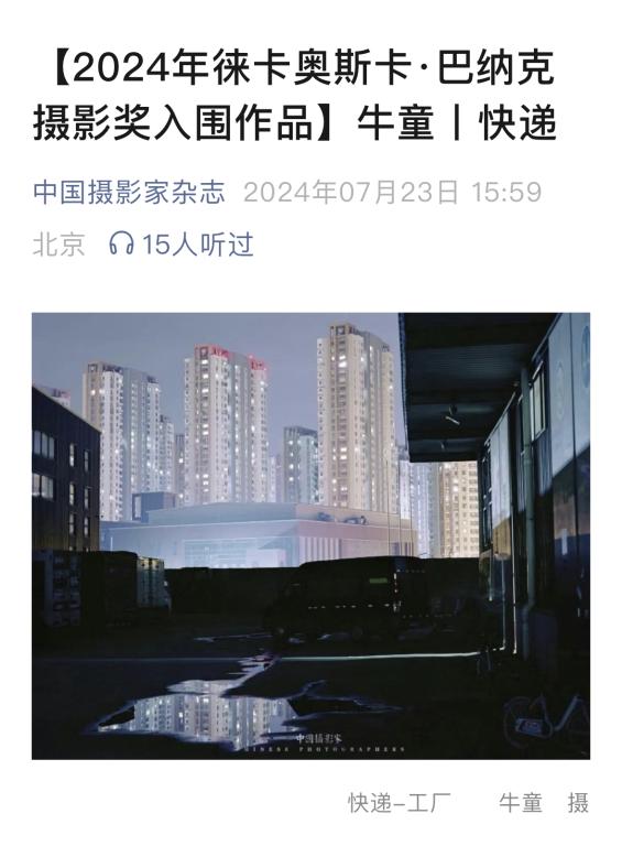 值得一提的是,牛童老师的《快递》系列此前已获得国际认可,成功入围了2024年徕卡奥斯卡巴纳克摄影奖(Leica Oscar Barnack Award),这是摄影界最具声望的奖项之一,旨在表彰摄影师在视觉叙事和摄影艺术方面的卓越成就。今年十月,牛童老师也会带着他的作品去往德国徕卡博物馆进行展览。