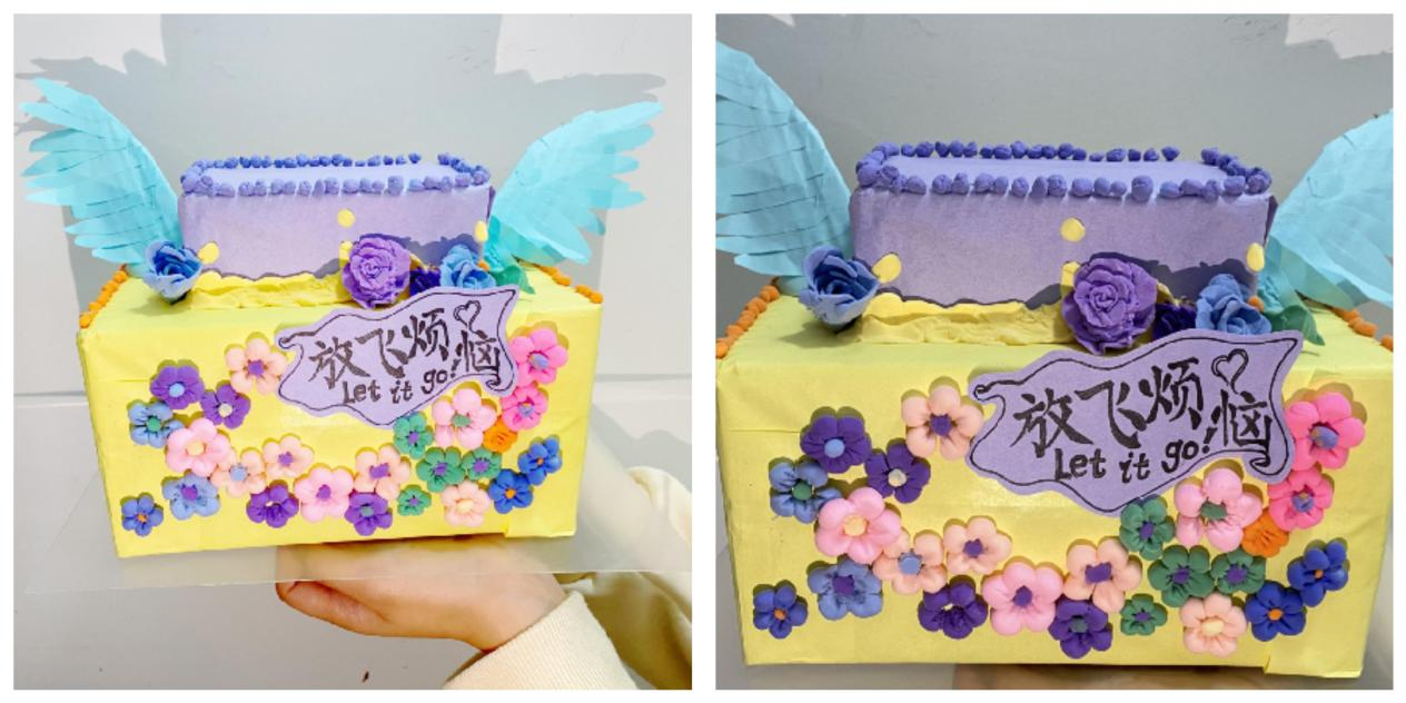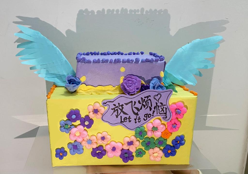 设计思路:作品整体由蛋糕形状的的盒子、翅膀和小花点缀组成。一眼看去蛋糕让人联想到甜蜜味道,能够让人保持心情愉悦,翅膀象征着自由和飞翔的能力,意为带走烦恼。