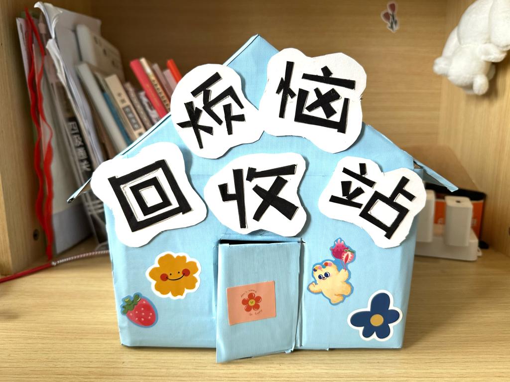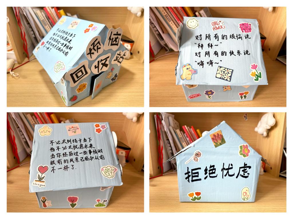 设计思路:设计这个蓝色房子形状的烦恼收集盒,我深受色彩与形状的启发。蓝色,作为一种冷静而深沉的色调,象征着宁静与平和,我希望它能像海洋一样,包容并化解人们内心的烦恼。而房子的形状,则寓意着安全与庇护,我希望这个收集盒能成为每个人心灵的避风港,让同学们的烦恼在这里得到暂时的安置。