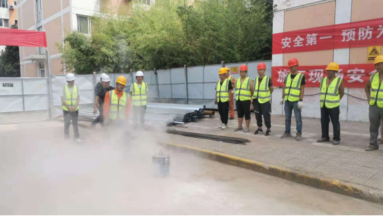 施工单位负责人王晓栋就如何观察灭火器是否有效,如何正确使用灭火器以及发生触电后如何立即切断电源和紧急施救对现场施工人员进行了讲解。在讲解培训后由现场施工人员实际演练操作。