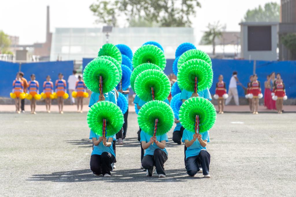 团体翻扇操《青春向太阳》与啦啦操表演活力爆棚。二百余名学子手持彩扇整齐划一,拼出“1999”、“2025”、“2026”等图案,映照学校的发展历程,展示了教学评建路上的拼搏期望。最后,将所有色彩汇聚成绯红爱心,定格成青春最深情的告白——以赤子之心,向未来启航!校健美操队紧随其后,伴随动感节拍,队员们托举、转体等高难度动作连贯流畅,花球如跳动的火焰,将青春热血与活力激情尽情释放,燃爆全场氛围。