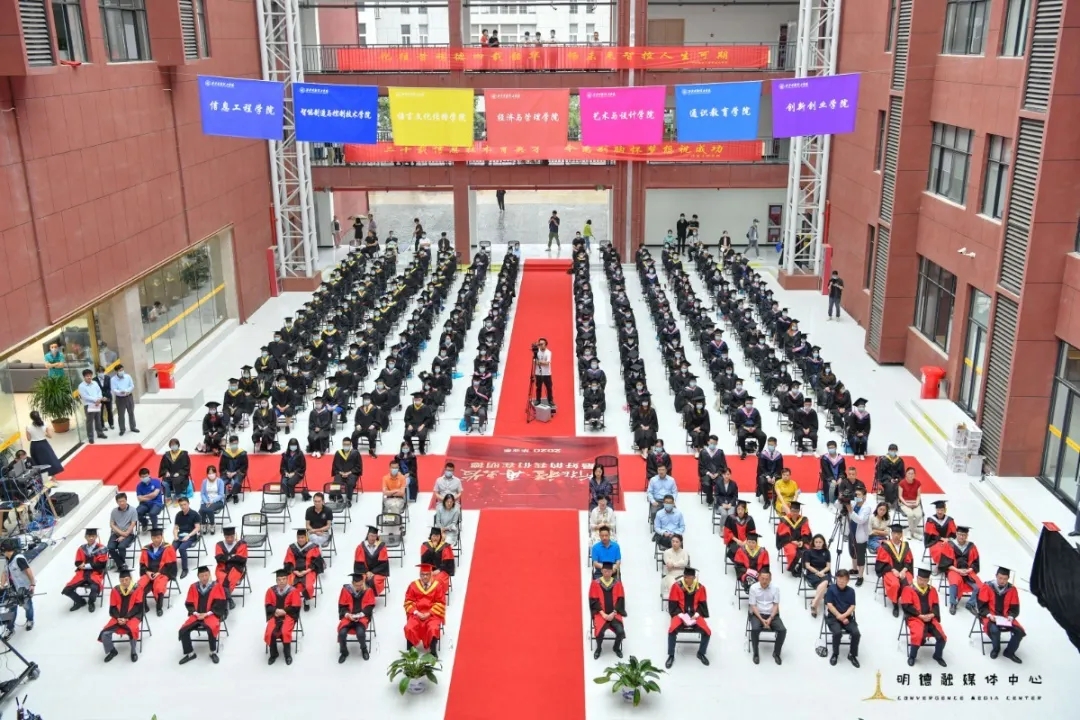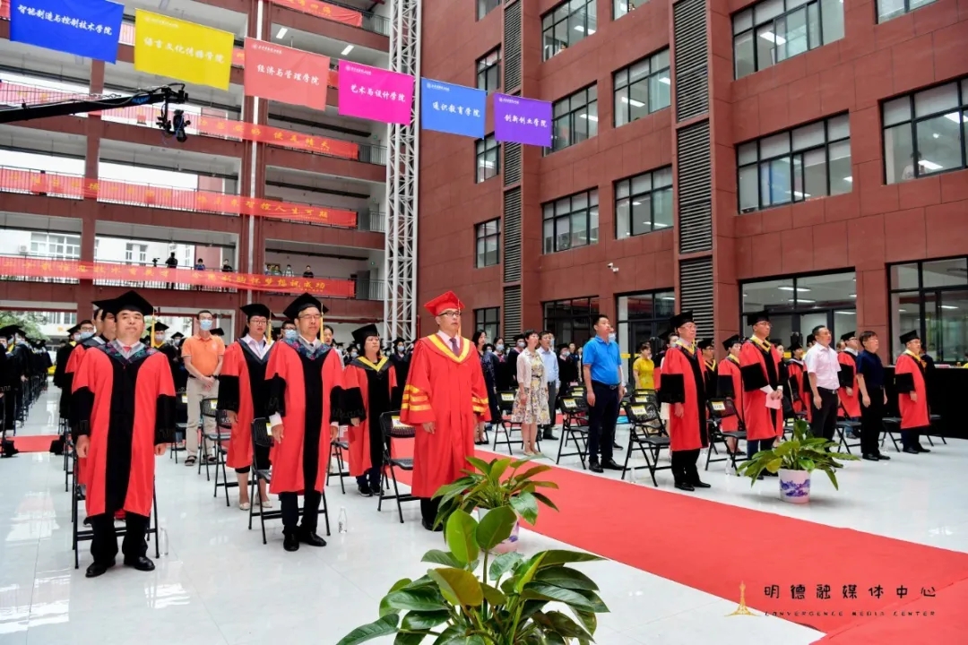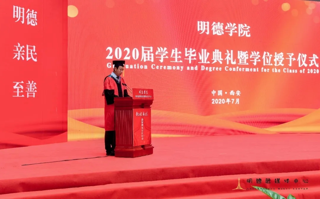 7月12日上午九时,明德学院2020届毕业生毕业典礼暨学位授予仪式在学院明志楼中厅隆重举行。因疫情防控要求,本次典礼采用主副会场加线上直播的方式举行。通过“学习强国”学习平台、西部网、陕西头条、新浪陕西、明德学院官方微博和官方抖音等新媒体平台对进行了“云端”直播,数万人次通过网络收看了毕业典礼。