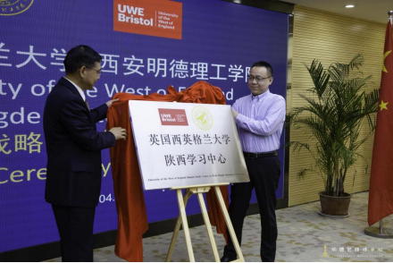 在热烈的掌声中,杨健君校长与严国玉先生为“英国西英格兰大学学术中心”以及“英国西英格兰大学陕西学习中心”揭牌。会后,由学院办公室主任韩娅舒陪同严国玉先生参观校园。
